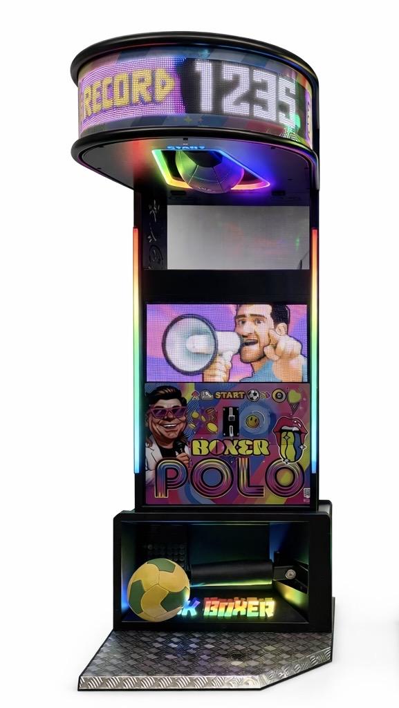BOXER POLO COMBO to atrakcyjna maszyna rozrywkowa typu boxer w połączeniu z kopaczem, która łączy klasyczną grę siłową z energetycznym klimatem disco polo. Urządzenie przyciąga uwagę nowoczesnym designem, kolorowym oświetleniem LED oraz dużym, czytelnym ekranem, który wyświetla wyniki, animacje i efekty wizualne